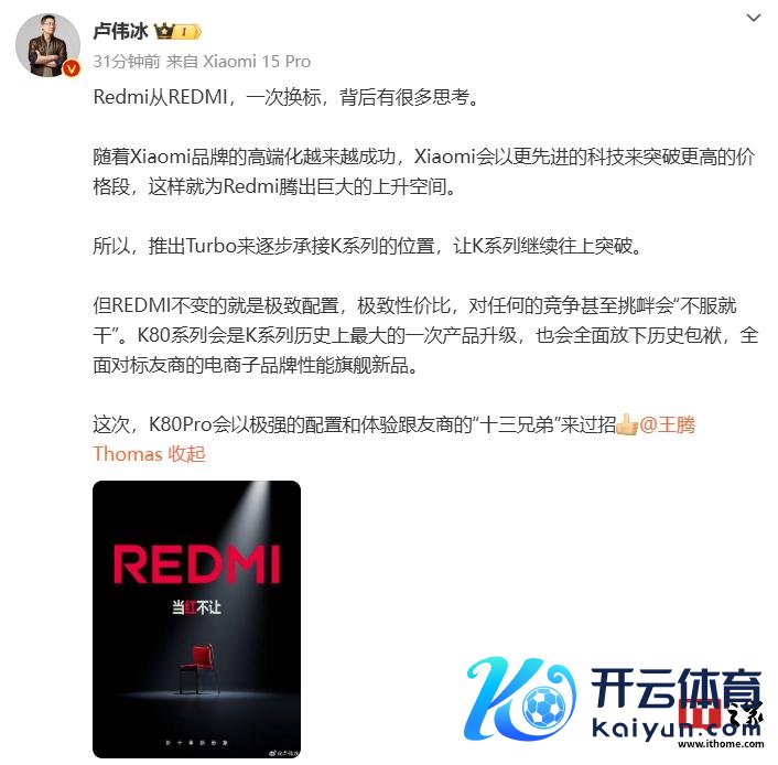 小米集中并伴东说念主、总裁,手机部总裁,小米品牌总司理对 REDMI 这次换标作出评释注解:Xiaomi 品牌高端化越来越告捷,Redmi 也有了更大的高潮空间,后续“Turbo”系列会说合“K”系列的位置,后者链接往上冲破。