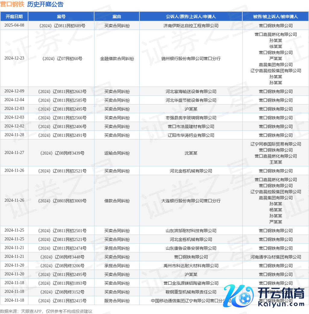 本站音问,字据天眼查APP露出,近日公布了一则营口钢铁有限公司手脚被告/被上诉东谈主的开庭公告,详备实质如下: