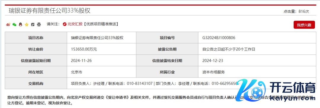 11月26日,北京产权来去所表露信息夸耀,北京市国有钞票盘算有限连累公司挂牌所捏瑞银证券33%的股权,转让底价为15.37亿元。