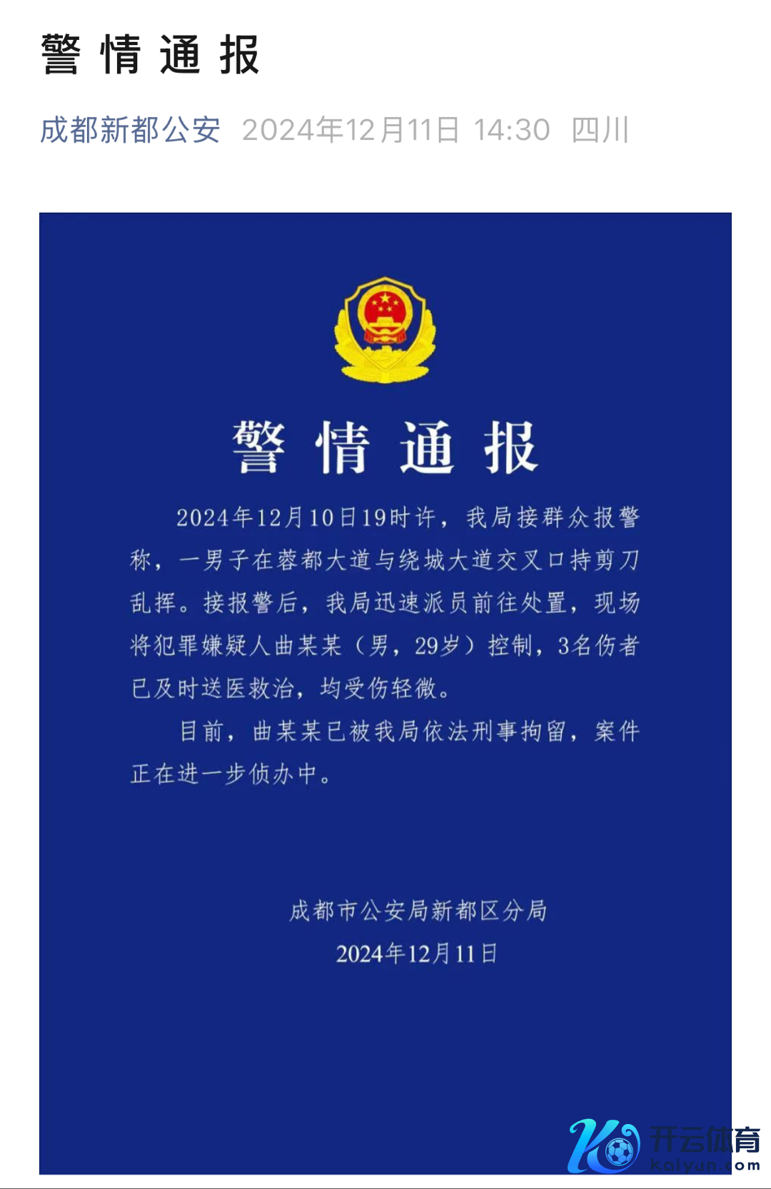11日下昼2时许,成齐市公安局新齐鉴别局发布通报,伤东说念主者已被警方照章刑拘,案件正在进一步侦办中。