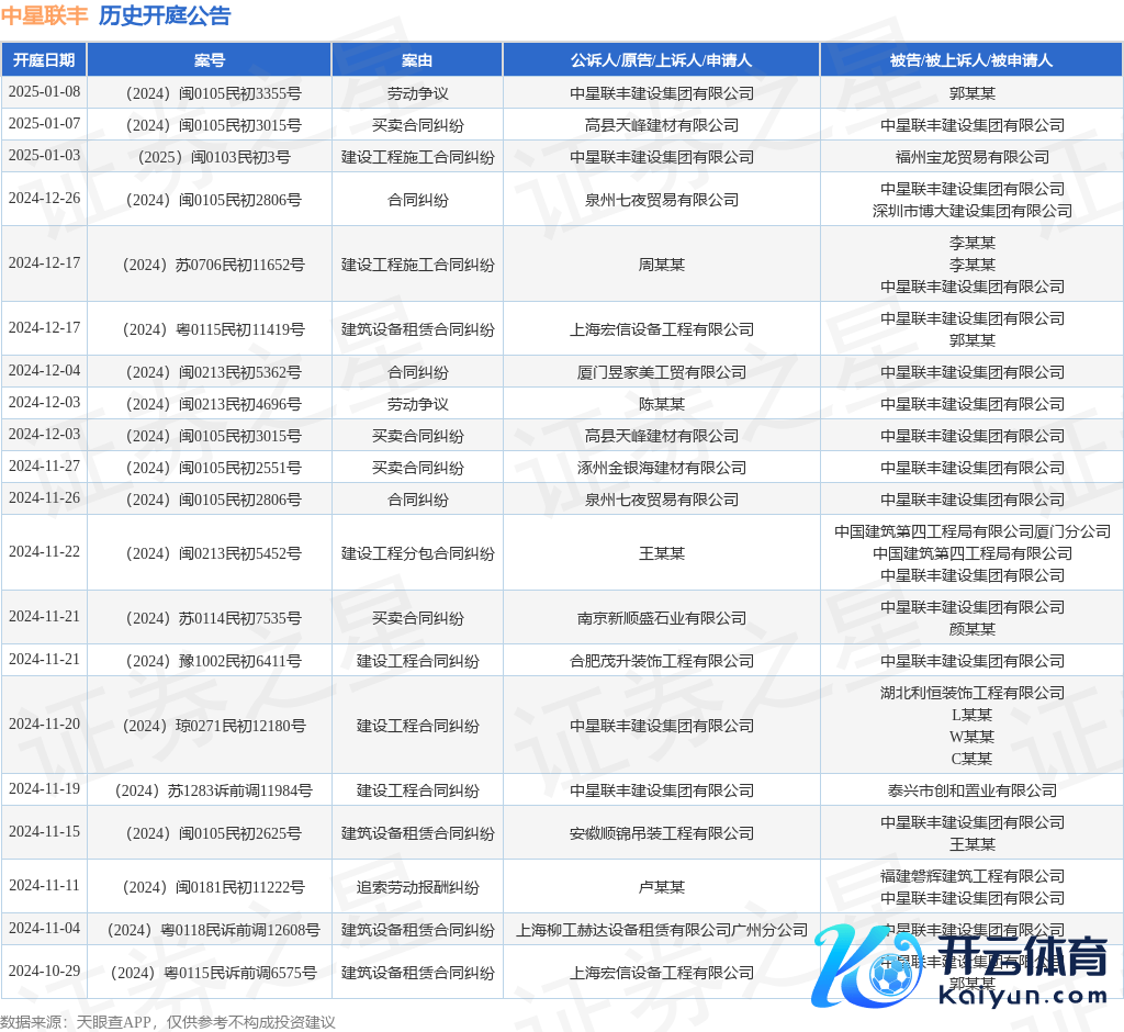 案号:(2024)闽0105民初3015号审理法院:福州市马尾区东谈主民法院案由:商业条约纠纷当事东谈主信息: 原告/上诉东谈主:高县天峰建材有限公司 被告/被上诉东谈主:中星联丰缔造集团有限公司开庭日历:2025年1月7日左证统计,近一年内以中星联丰缔造集团有限公司为当事东谈主的历史开庭公告有91则,其中案由为“缔造工程施工条约纠纷”的公告以18则居首,其次为“商业条约纠纷”有17则,“条约纠纷”有14则。历史开庭公告(前20条)如下: