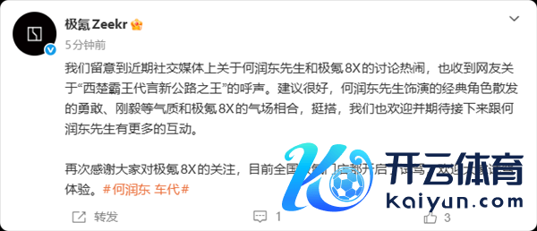 有网友建议“西楚霸王代言新公路之王”的建议,但愿让演过西楚霸王的何润东代言极氪8X新车,随后,极氪官方曾作出复兴: