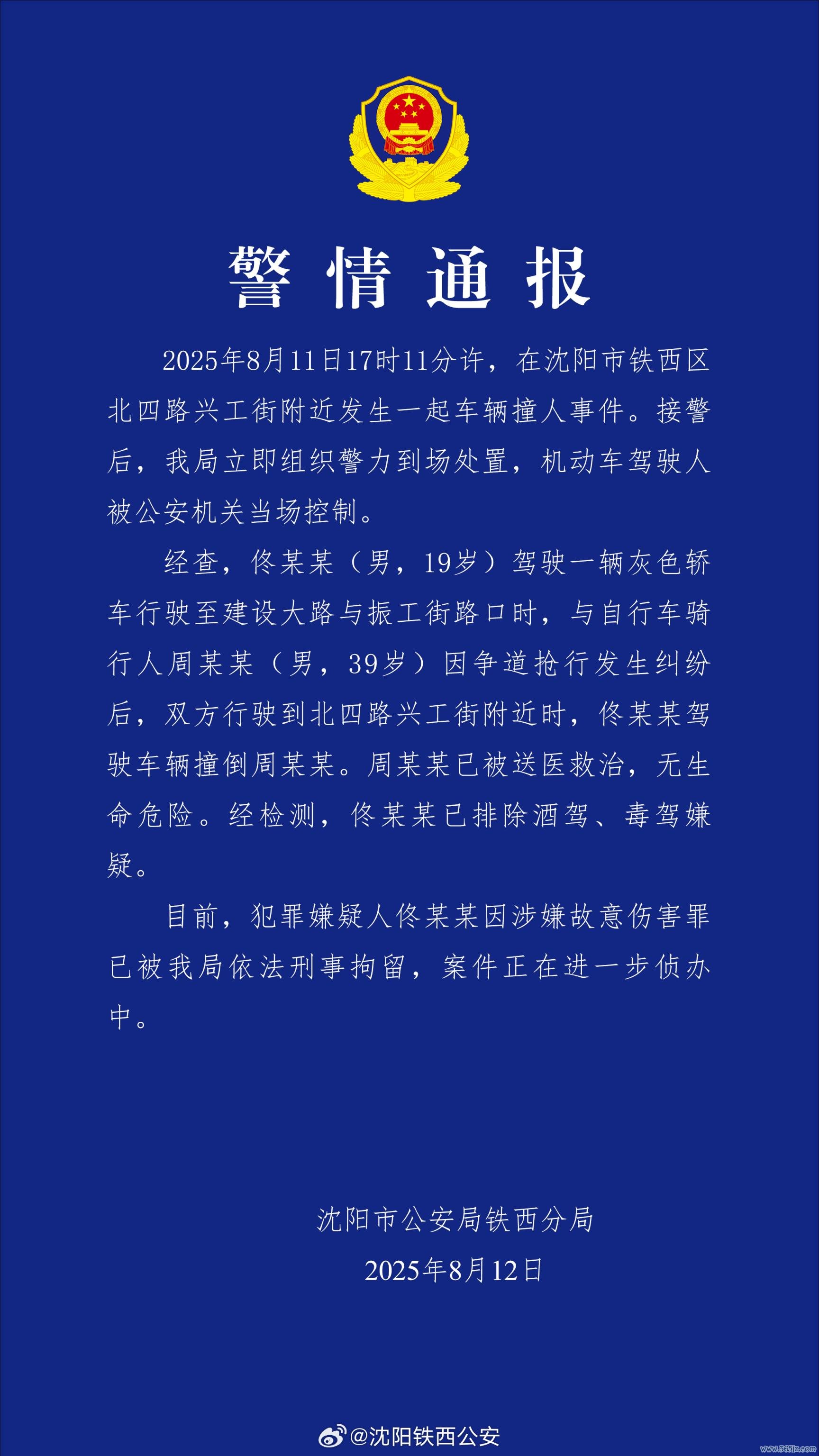 体育游戏app平台沈阳警方通报:因争说念抢行纠纷撞东说念主,19岁男司机被刑拘-开云app下载ky官方网站入口登录
